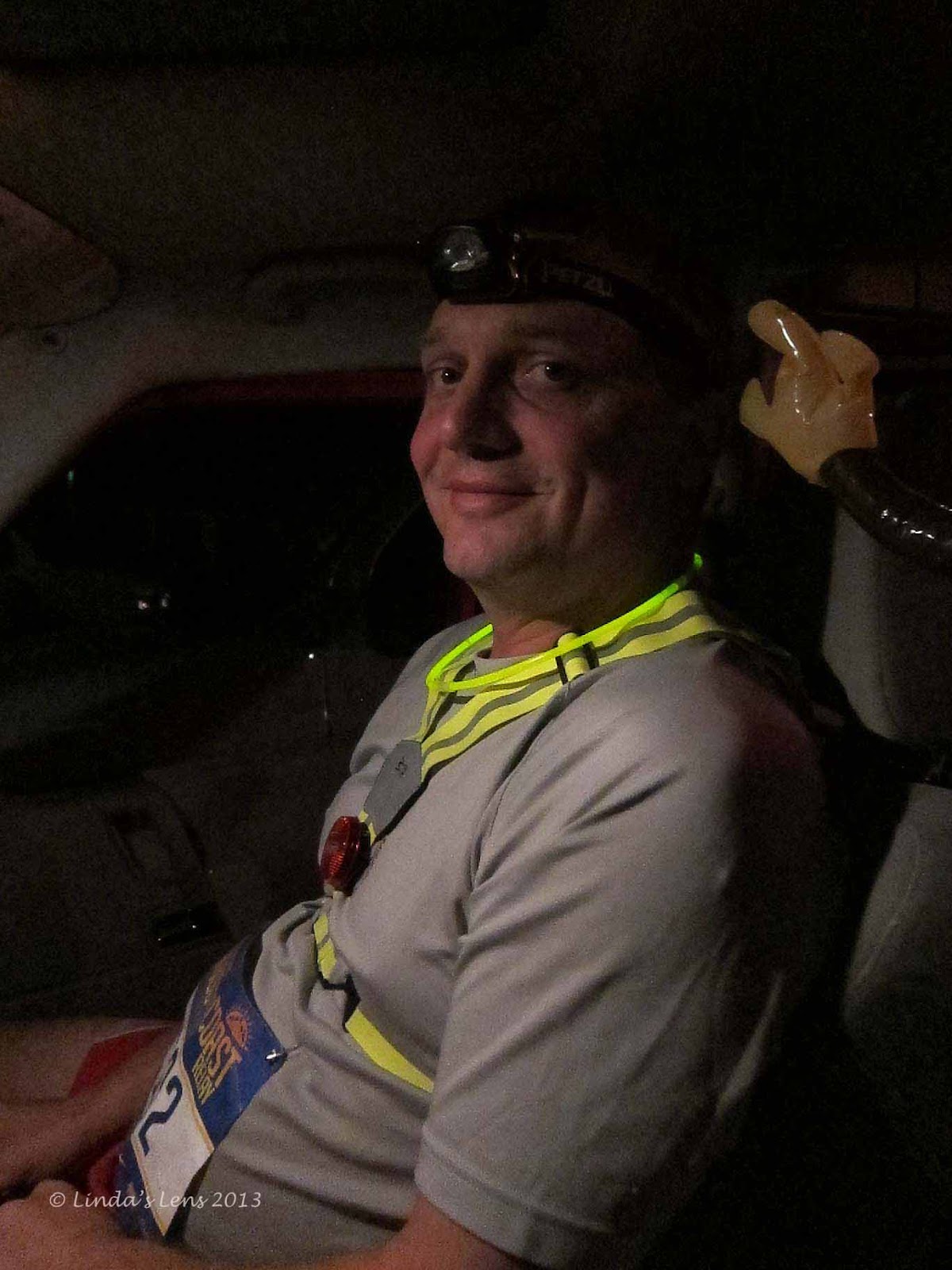 Off to the exchange area, I waited nervously for our runner and fretted about my next leg. Then our team number was called, and Eric materialized out of the dark. Grabbing the by now very sweaty wristband, I willed my legs to move. Time to get this show on the road!