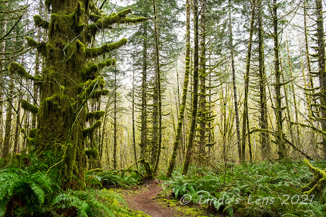 So hubby and I navigated our way through the closed Jones Creek Campground, making a couple of wrong turns before finding the correct connector trail. This path wound through a beautiful forest full of mossy old trees and huge green ferns. I kept finding so many photo subjects it took me awhile to cover the extra half mile distance. But it was so pretty I was glad for the detour.