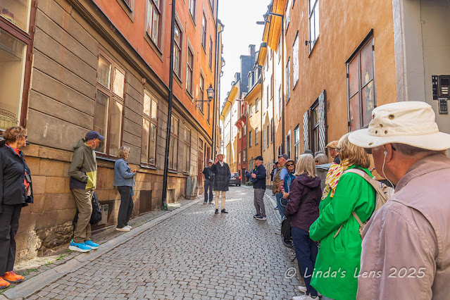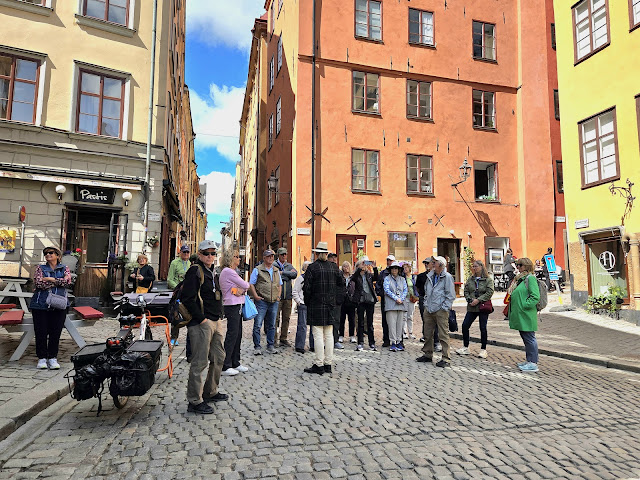 Several times our group gathered in the middle of the narrow, cobbled streets listening to Håkan talk about historical events and facts about Gamla Stan. Since autos were allowed on these streets, we had to press ourselves up against the buildings a couple of times, to accommodate vehicle passage. One errant car drove by and then realized they'd made a wrong turn (darn Google maps!) Since there was no place to turn around, the driver was forced to back down the narrow lane. Håkan stepped in and calmly guided him to the next intersection.